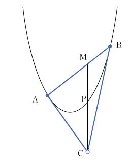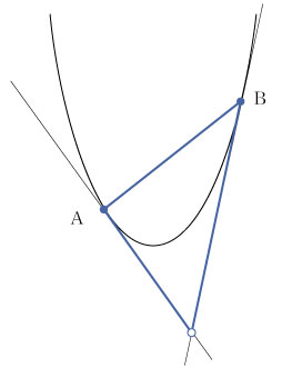| 放物線 y=x2 上に2点 A,B をとり,この2点における接線と直線 AB が決める三角形に着目する.
