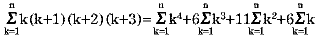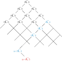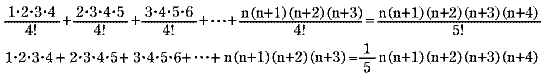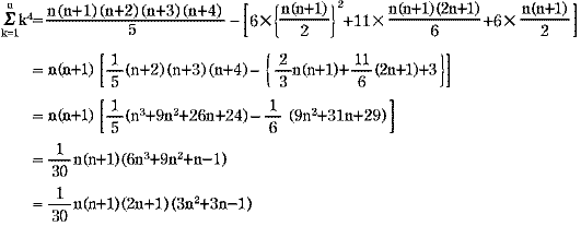| 「数学切抜き帳」を書きはじめてそろそろ60回になるが,筆者の手持ちの話題はとっくに底をついた.編集のIさんに励まされてなんとか続けているが,生き残りをはかるためこれからは新しい話を創っていかなければならない. ● よく知られた公式 次の公式はよく知られている. ● Σk4の計算の方針 k(k+1)(k+2)(k+3)=k4+6k3+11k2+6k ここで Σk4 以外の和は求められる. 4C4,5C4,6C4,……