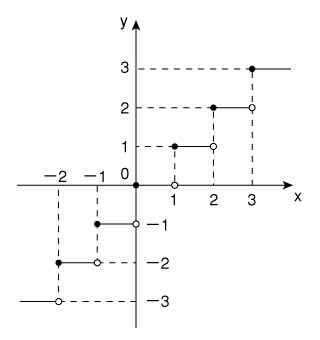 y =[x]のグラフは、下のようになります。 線の切れているところでは,● のところは含み、○のところは含まれないものとします。
