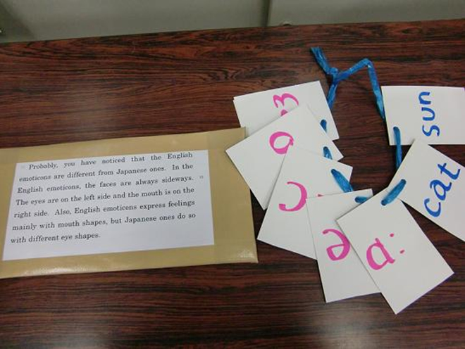 発音記号が正確に読めるかどうかのチェックは,時間と根気が必要であるが1対1で行う方法以外ない。全ての発音記号をチェックすることは時間的にも難しいので,授業内で練習をした後,母音だけ抜き出した発音チェックカードを作り,休み時間を利用して生徒一人一人が正確に発音できるかをチェックした。音読ボードは発音チェックカードの発展形である。教科書の本文をパラグラフごとに切り取り,拡大コピーをして段ボールに貼り付けて作成。全員が本文の英語を正しくスムーズに読めるかをチェックすることは授業内では難しいので,休み時間を利用して行った。生徒たちはどのパラグラフが自分にあたるかわからないので,結局はそのパートをすべて読めるようにしておかなければならない。そのため音読テスト前には隙間時間を使って,生徒同士で発音やイントネーションのチェックをしたり,制限時間内に読めるかどうかを確認し合ったりして準備をした。これを行うことで,生徒たちのコーラスリーディングに対する意識も高まったように思う。