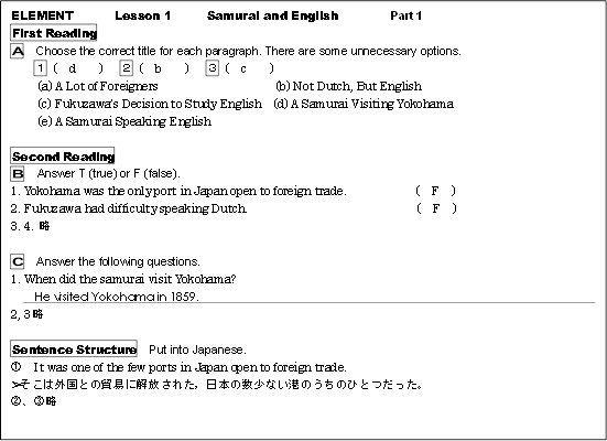 図1はElement付属のCDロムの資料から取捨選択して作った授業用のハンドアウトの一部である。生徒は教員の指示や説明を聞きながら,ハンドアウト上の質問に解答して行く。解答解説については基本的に板書は行わず全てタブレットから大型テレビに映し出す。映し出すデータは教員が分担して作った共通のものである。共通フォーマット,共通データを使って授業を進めることで,全ての担当者が一定レベルの授業を行うことができる。しかし全ての担当者が全く同じ授業をしているわけではなく,英語で授業を進めながら如何に生徒の興味を引き,意味のある英語のやり取りを行っていくかが,個々の授業担当者の腕の見せどころである。