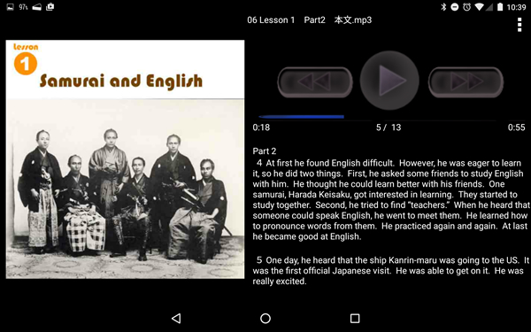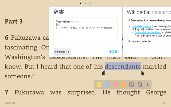 生徒は予習をしない代わりにしっかり復習することが求められる。その際にタブレットを使用することによって密度の高い学習を行うことができる。タブレット端末にはElementⅠを電子書籍化したもの2(図2)が内蔵されている。電子書籍には単語を指で長押しすると辞書が立ち上がる(図3)などの利点があり,授業中には詳しく扱わなかった単語や語法を確認することができる。さらに別に内蔵している音声教材をタブレット上で再生すると教科書を開かずにレッスン内容を確認しながら音声を聞くことができる。授業でシャドーイングやディクテーションテストなどを行っているので生徒は家庭で,なんども音声を聞き音読してくることが求められる。