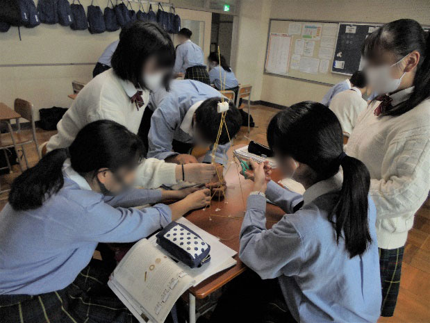 マシュマロチャレンジとは,パスタ(乾麺),ひも,マシュマロを使い,制限時間の中で自立可能なタワーを立てることを共通の目標としたチームワークやコミュニケーション能力が必要とされる活動である(写真1,2)。筆者は,この活動について書かれた教科書『Revised ELEMENT English CommunicationⅠ』(啓林館)の英文を読み,実際に「マシュマロチャレンジ」の体験,考察を含んだ計2時間の授業を実施した。そこから得た生徒の学びが今後の教育のあり方を考える上で有益であったので,紹介したいと思う。授業の概要は,おおよそ次の通りである。