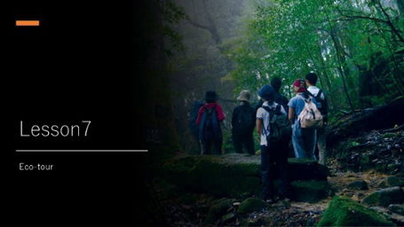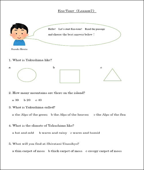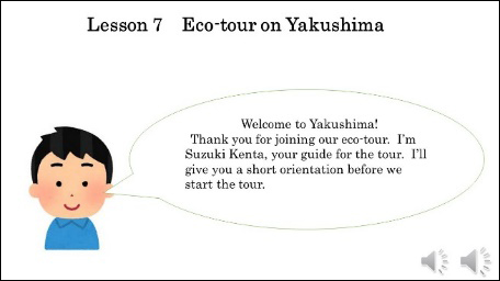 教科書の利用にあたっては青森県立田名部高等学校で実施していた「TANABU Model」を参考に教科書のレッスンごとに比重をかえた指導を行ってきました。LANDMARK Fit English CommunicationⅠ(コI 341)の比較的取り組みやすいテーマでは表現活動を多めに導入し,環境問題や歴史に関するテーマでは本文の内容理解を丁寧に指導し,表現することで様々なテーマで自分の意見を深く表現できる力を身につけることができたと感じています。特にLesson7 Eco-tour on Yakushimaでは写真のように,本文で出てくるSuzuki Kentaになりきって教室内でエコツアーを実施しました。