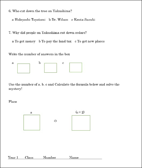 各Part2~4の英文を教室や廊下に掲示し,グループで英文の内容を読み理解する活動です。その際に,下図のようなクイズを用いたワークシートを配布し,班で本文をツアーのように周りながら英文を読むアクティビティを導入しました。各問題に関しては,教科書や教科書データ内にある英文の問題を利用しました。また,最後の問題はそこから導き出される記号を計算し,正解の教室に移動するトレジャーハントの要素を入れた形式での本文読解を実施しました。