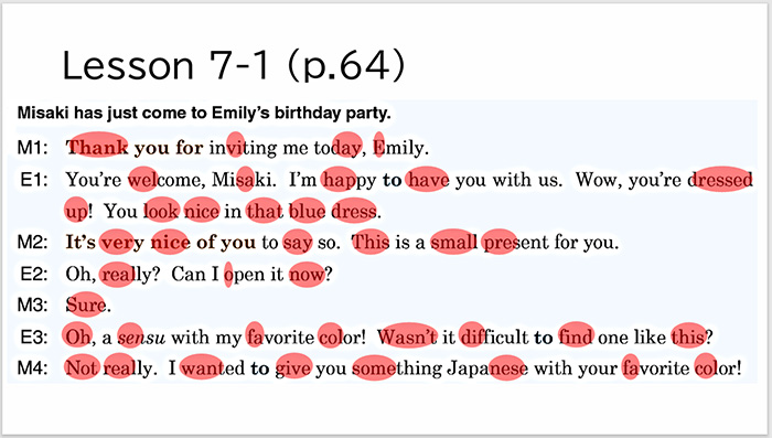 次に,時間の許す限り音声指導を行っています。Vision Quest Ⅰ Advancedでは,各LessonのLogic & ExpressionがModel Conversationで始まっています。こちらを利用して,英語のリズムを中心に,音声指導を行っています。図1が授業で扱ったスライド例となります。赤色の箇所が強勢をもつ音節を表しています。