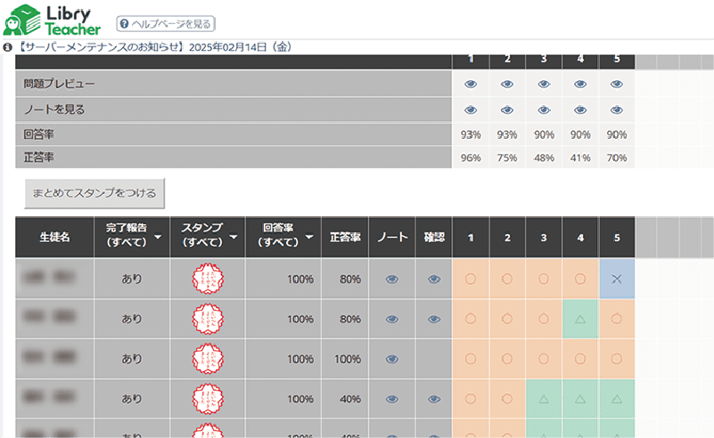 生徒の学習状況・クラスの正答率の「見える化」で,生徒へのフォローも手軽に行えます。