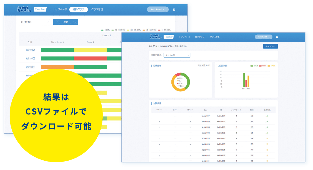 生徒が取り組んだ時間,回数,点数を確認することができます。