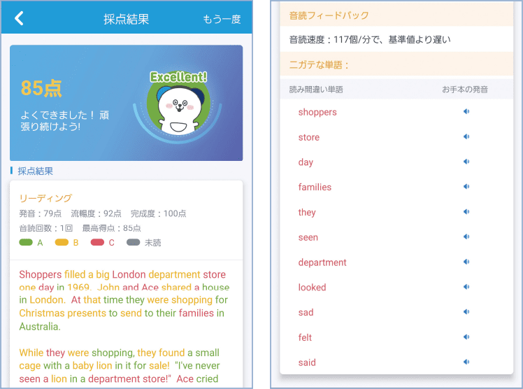 「発音」「流暢度」「完成度」の観点で採点。どの単語が苦手か,一目でわかります。