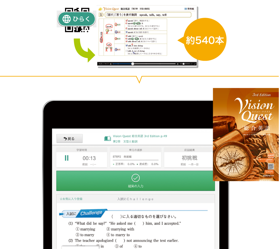 画面のQRボタンを押すと、解説動画を視聴できます。苦手な文法の説明は動画でしっかりと復習し、理解を深められます。