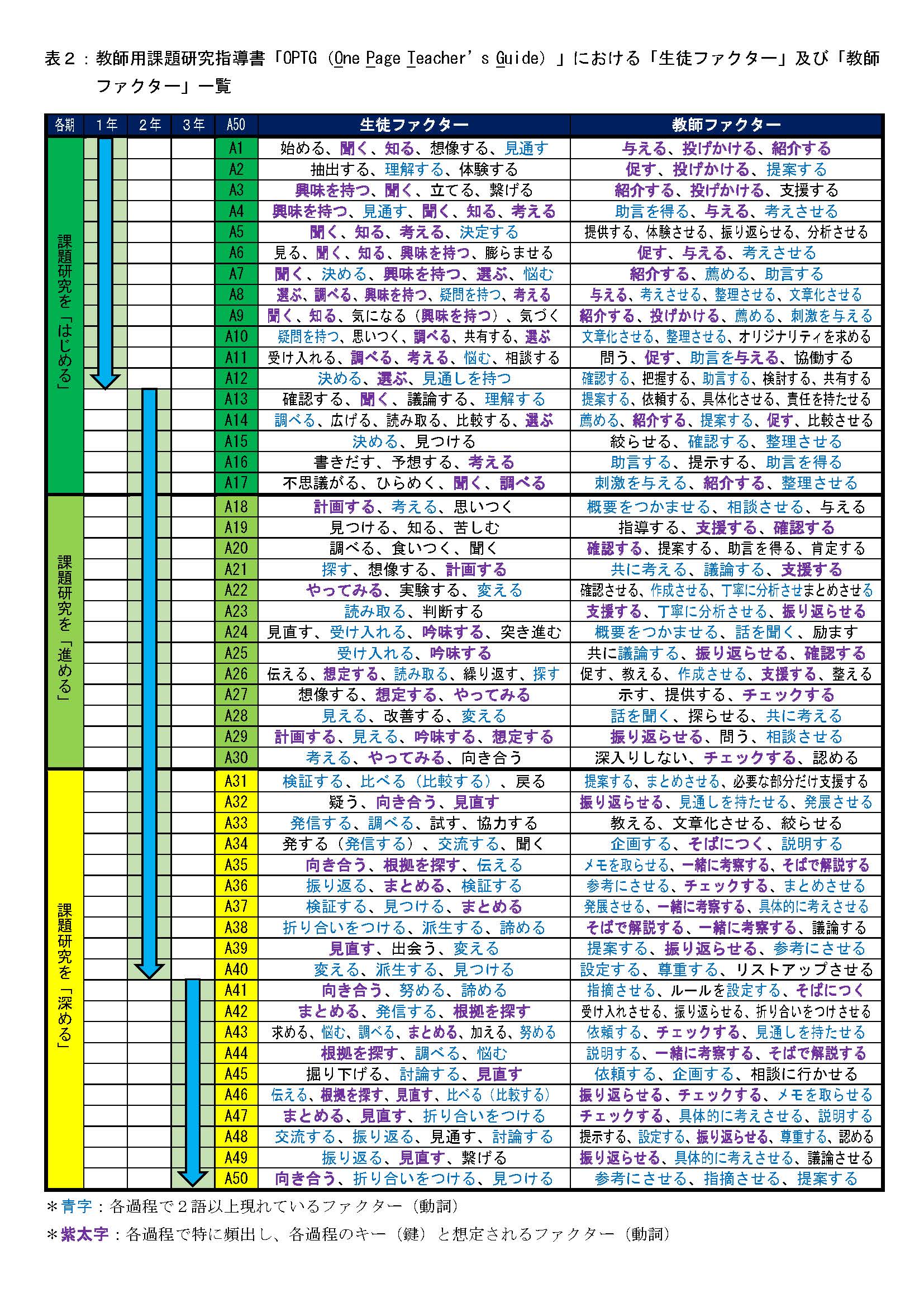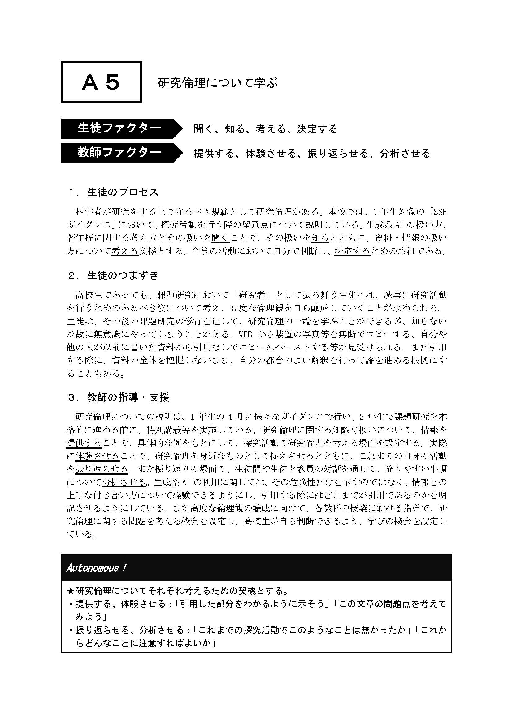 「Autonomous 50」の項目に対して,各1頁の指導書である「OPTG」を作成した。各「OPTG」の冒頭には,本校教師の課題研究指導ポートフォリオ及び本校卒業生を対象とした調査から抽出した「生徒ファクター」及び「教師ファクター」を列挙した。また,内容は「生徒のプロセス」,「生徒のつまずき」,「教師の指導・支援」の3項目で構成し,文中に「生徒ファクター」及び「教師ファクター」に相当する動詞を下線(「生徒ファクター」は一重線,「教師ファクター」は二重線)で示した。さらに,末尾には,「Autonomous!」として,教師の指導・支援のポイントを整理した。 |