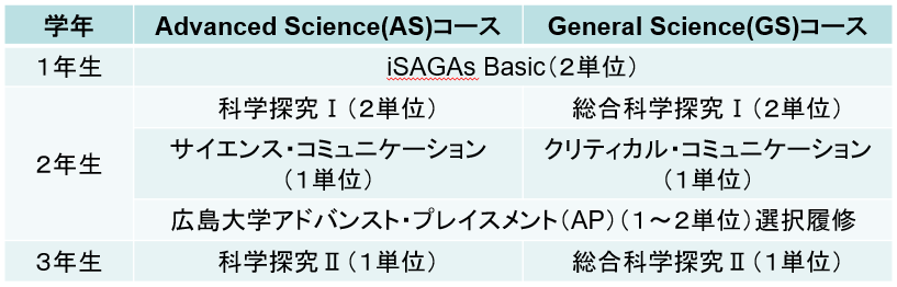 本校は,文部科学省指定のスーパーサイエンスハイスクール(SSH)指定校です。本校のSSH事業は,2003(平成15年)年度の第1期指定以来,令和7年度で23年目を迎えます。令和5年度からの先導的改革型第Ⅰ期では,グループで約3年間かけて探究活動を行う課題研究の深化・発展を目的として,カリキュラム開発を開始しました。この目的を達成するために,学校設定教科「iSAGAs(あい探す)」を設定し,生徒全員が課題研究を行うための学校設定科目を履修します。また高大接続を一層強化して,希望者は広島大学の教養科目・専門科目の一部を履修できるようにしています。生徒は,1年生で課題研究を始めるための基礎について学び,2年生から希望に応じてAS(Advanced Science)コース,GS(General Science)コースに分かれて「課題研究」に取り組みます。ここでは,「学び方を学ぶ」課題研究の取組について紹介します。