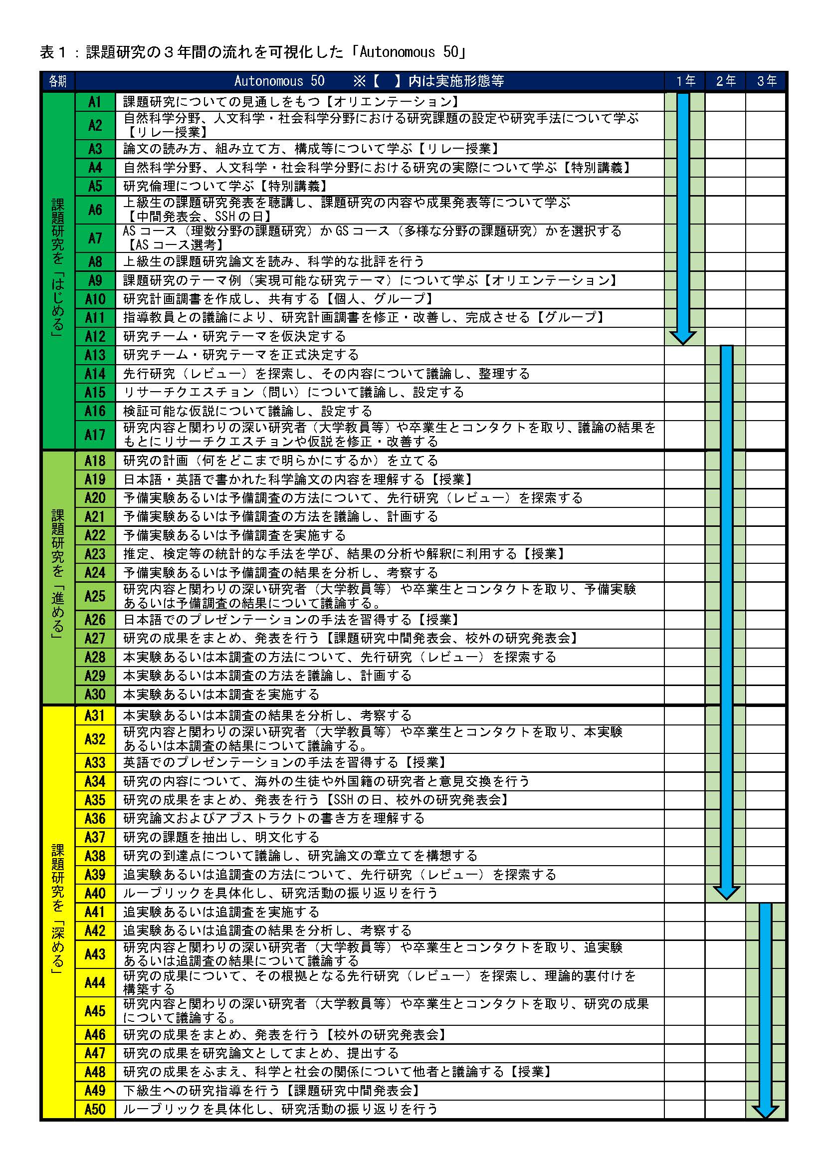 1)「Autonomous 50」 本校の課題研究の3年間の流れを,「はじめる」(1~2年生),「進める」(2年生),「深める」(2~3年生)の3期に分け,「Autonomous 50」として,50項目の過程に細分化・具体化した。 |