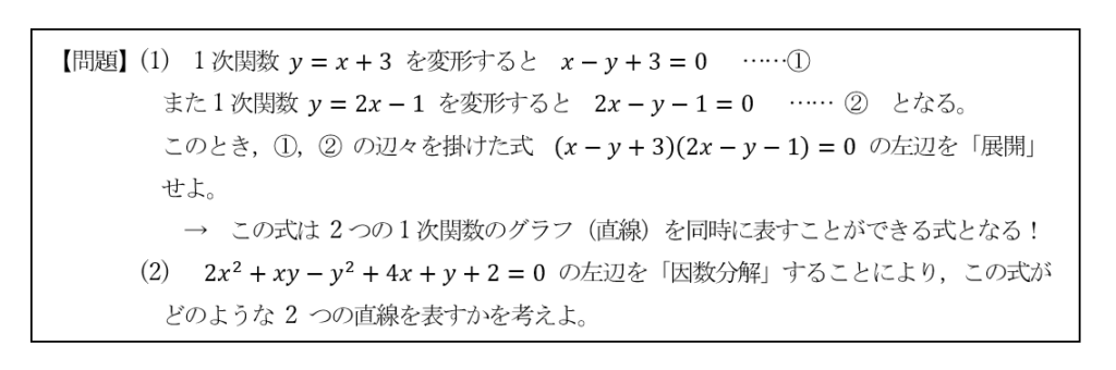 ・第1節多項式においては,文字が複数になり式全体の複雑さが増すこと,また展開はできるが,「逆」に戻す因数分解はうまくできない生徒が多く見受けられる。