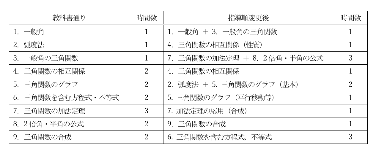 指導順の変更で意識したことは,数学Ⅰ「三角比」の分野の復習・学びなおしを行いながらスタートできるようにしたこと。その流れから準有名角の三角関数の値をここでは度数法を使いながら求めつつ,扱える三角関数の値を増やすこと。そこからグラフに移行し,正弦曲線の原点における接線の傾きを考えさせることで,度数法がグラフに適さないことを認識させ,弧度法を導入。グラフの平行移動等を確認し,グラフの足し合わせから合成を考えていった。細かい分野間の接続を事前に考えて実施したため,進行はスムーズにできた。