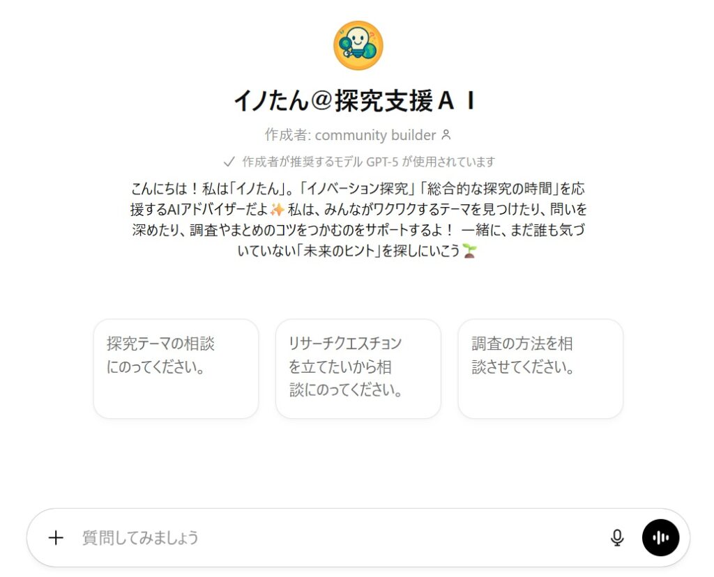 本校の探究活動はクラスメイト,教師,連携している学術機関の方,京都中小企業家同友会の会員の方等と対話・協働を通じて探究に対する見方・考え方を広げることに特徴があります。今年度はこれらにAIエージェント「イノたん」が加わりました。ちょうど生徒と教師の間くらいの話しやすさの位置にいる存在になることを期待しています。