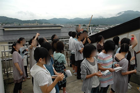 - 写真1:ドーム脇の屋上で部分日食の観測中 後ろに写っている望遠鏡のようなものは,生徒が手作りしたピンホール式の太陽投影装置