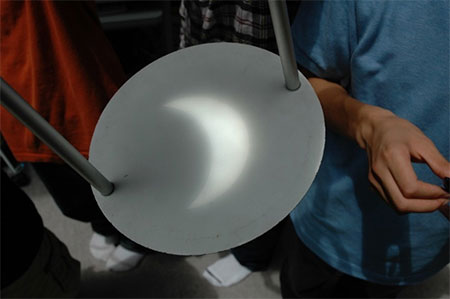 - 写真2:部分日食中の太陽投影像 ドーム内の天体望遠鏡に太陽投影板を取り付けて,部分日食中の太陽投影像を撮影