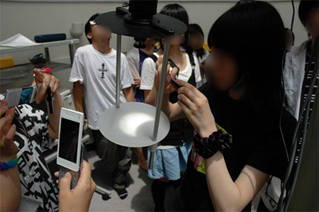 - 写真3:太陽の投影像をスマートフォンで撮影する生徒たち
