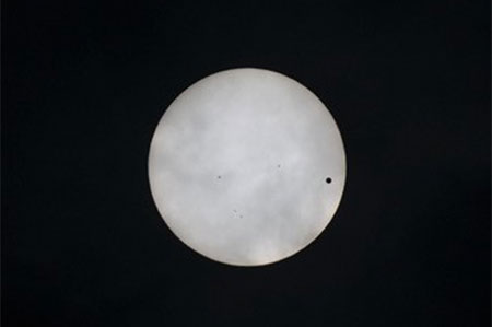 - 写真4:金星の日面通過 太陽面右側の小さな黒い丸が金星。その他太陽黒点もいくつか写っている。薄曇りの中で撮影したため光球面に靄のような濃淡が見られる。