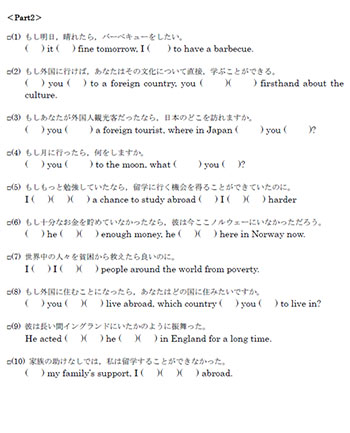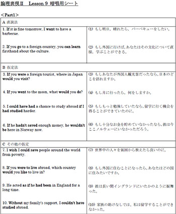 授業始めには,教科書example bankの例文を用いた暗唱を,段階を踏みながら行っています。生徒は暗唱シートを使って,①日本語が見える状態で英文を音読,②穴埋めをしながら音読,③和文英訳までをペアで行い,その後,④教師が日本語を言い,生徒が英訳するという活動を行っています。英文を何度も口にすることで記憶に残る実感を持たせています。