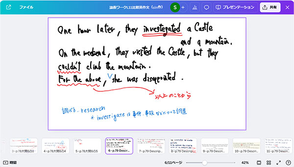 ワークの英作文問題については主にCanvaを用いています。特に英検対策に使えそうなLesson7やLesson11などのDescriptionは人によっては書く内容が変わるので,複数人に解答させて,内容を比較しました。グループを組んで相談させながら英文をつくった時もあります。