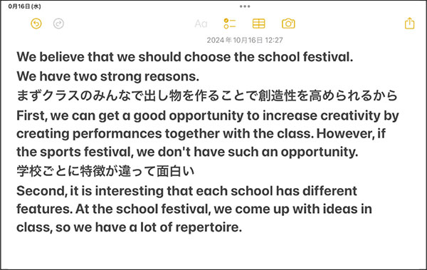 Lesson11ではディベートの手法について書かれていました。ディベートは探究活動との相性が良いので,難しいかなと思いながらもやらせてみました。この時は「即興型英語ディベートの流れ」を参考にして,学校生活に関するテーマで実施しています。