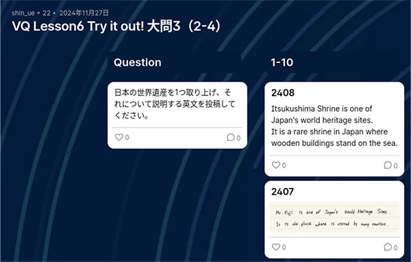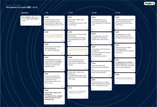 Padletでは生徒の意見が1ページで掲示板のように表示されるところが良いと感じています。画像はLesson6 Try it outの大問3を参考に,日本の世界遺産について説明させたものです。いくつかの投稿についてフィードバックしていきながら,文法ミスに関するクラス全体の傾向について指摘することができました。(このクラスはwhereの使い方について見直す必要がありました。)