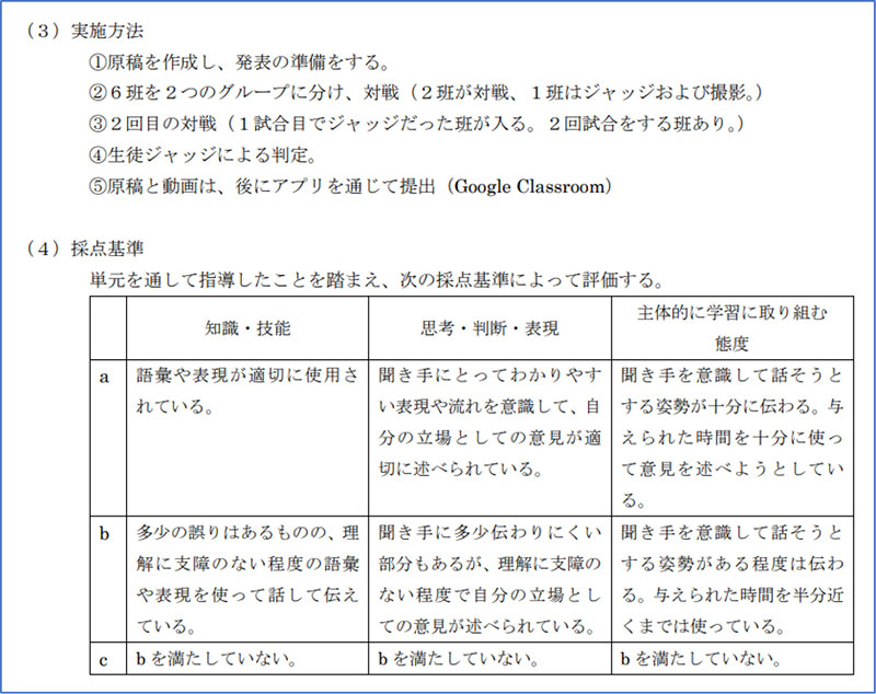 50分で全班の発表を終わらせたかったので,肯定・否定・ジャッジのグループを2つ作り,同時に実施しました。評価項目として「比較表現の適切な使用」を挙げたので,その確認のため,発表内容を原稿として提出させ,当日の発言の様子については,動画撮影をして記録に残しました。