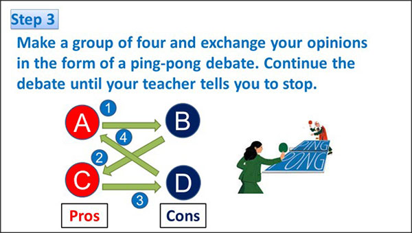 ピンポンディベートは,パーラメンタリーディベート(Parliamentary Debate)のような本格的な競技ディベートとは異なり,議論の時間を短縮し,素早く交互に意見を述べ合う形式の簡易的なディベートである。それゆえ,気軽に始められ,生徒たちが授業で学んだ英語表現を使って自分の意見や考えを発信したり,論理的思考力を高めたりすることができる点で,効果的な教育手法であると言えよう。本稿では,ピンポンディベートの基本的な考え方と,実際の授業での導入方法,そして英語の4技能5領域の能力向上のための具体的な方法についてご紹介したいと思う。