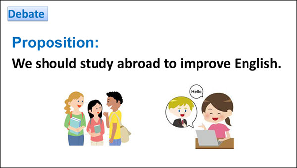 ディベートの過程で,相手の意見に応じて自分の考えを即座に表現し,議論を展開する練習を重ねることで,対話を通じたスピーキングスキルを効果的に高めることができる。