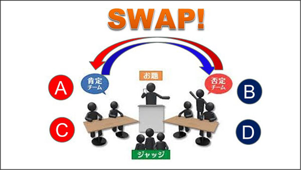 次に,ジャンケンでPros (賛成)とCons (反対)の立場を決める。また,ディベートの途中でPros (賛成)とCons (反対)の立場を交代する(図3)ことで,論理の柔軟性や思考力の幅を広げることができる。