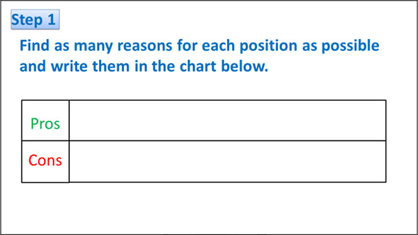 まず,説明・準備については,2.(1)で述べたように,教科書と関連したトピックが良い。例えば,”We should study abroad to improve English.”のようなテーマは,初めてディベートを導入する際には大変適している。ディベートのテーマを発表したら,該当の教科書ページを開かせ,学んだ表現や単語,根拠となる内容面の振り返りをさせながら,ワークシート(図4)に記入させる。あらかじめ,Pros (賛成)とCons (反対)の両方の立場から考えさせることで,論理的思考力を高めることができる。