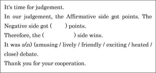 この時には,Moderator(司会者)役としてALTの協力を得て行うと英語を使用する必然性が増し,さらに盛り上がる。また,生徒2名にJudgeをさせ,最後の勝敗の発表と簡単なコメントを言わせると良いだろう(図6)。