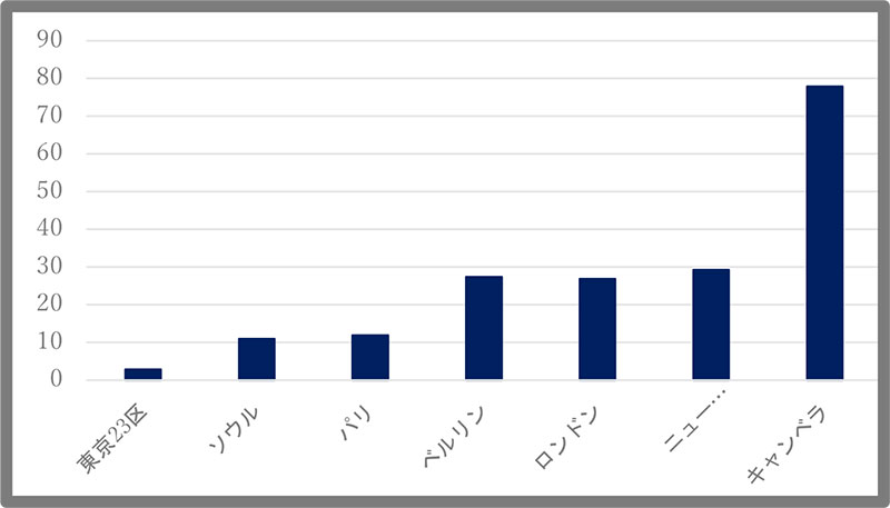 まず以下の図を見せて,何を表す図かどんどんヒントを出しながら生徒達に当てさせます(授業開始時は,図や絵や短い動画を見せて「何々?」と前のめりにさせたいものです)。ティーチャートークと雑談を融合させながら,『世界主要都市における1人当たりの公園面積の比較』という答えにたどりつくまで幅広い生徒の意見を拾います(眠たそうな生徒はここで欠かさず質問!)。