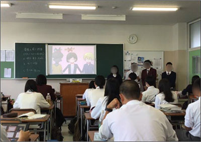 リテリングテストは補助教材に入っているイラストとキーワードから本文を再構築する(再話する)ものだが,本校では生徒がそれぞれあらかじめ自分で準備してきた英文を覚えて書く(もちろんアドリブでもいいが)というライティングテストの形式をとっている。また,紙芝居発表は本文そのものを台本としてそこにストーリーに沿った形でスライドを付け,グループで暗唱して発表するというものだ。これらの準備・練習にも自らPocket Speaking(ポケスピ)を活用する生徒は多い。