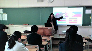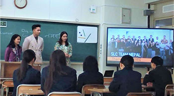 1年目はバングラデシュの添削者の方,2年目はネパールの添削者と運営管理の方に来ていただきました。どちらの方も,自国の文化や特色についてプレゼンテーションをして下さり,生徒の質問に丁寧に答えていただきました。例えば,バングラデシュの添削者の方は,伝統的な衣装や文化について紹介してくださいました。ネパールの添削者の方は,ネパール語の文字や,ネパール料理について紹介してくださいました。バングラデシュでは,公用語はベンガル語ですが,若者の多くがビジネスレベルの英語を話すことができることや,ネパールの私立高校では英語のイマージョン教育が盛んなことを聞いて,多くの生徒達が驚いていました。普段なじみの少ないアジアの国々の実情を知り,日本との違いを考える良い機会になりました。