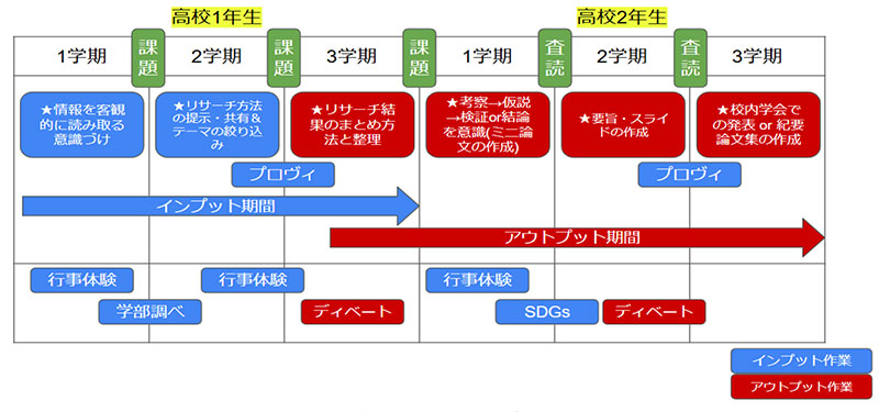 今年度の高校1年生文理コースの生徒については,「問の立て方」「情報の集め方」「探究活動のテーマ探し」「論理的思考のプロセス」といった中期的な目標を設定し,その間に講演会等のインプットの場面を設定してきました。これらの探究の時間の取り組みは,高校1年生開始前に担当者間にて検討を行い,二カ年計画の概要(図1)をベースに実施しています。