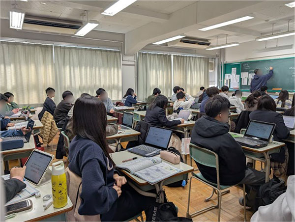 →本校が導入しているGoogle Workspaceのmeet機能を使い,複数クラス間における並列的な授業展開を意識しました。(写真1)課題や資料はclassroomを通じて,生徒の手元に残るように配信をしました。各教室に備え付けの電子黒板への投影をすることで,並列的な授業展開を実現することができました。また,投影する資料を事前に学年団へ共有をしておき,適宜助言等をクラスに与えてもらうよう打ち合わせました。