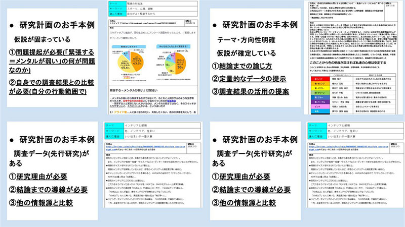 図 2 探究活動の取り組みが早い生徒の計画書をコース全体で共有。それに加えて,教員から見て改善が必要なポイントを提示した。
