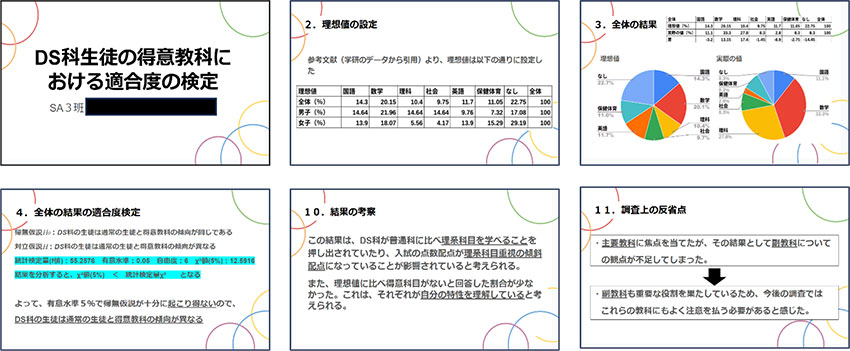上記①~③の構成で,毎時間の授業を進めることで生徒に少しずつ統計の活用における素養を高めていった。このように学習を進めることにより,生徒に課題研究や日常の学習の中で徐々に統計用語や検定を実際に用いようとする姿勢が見られるようになってきており,取組の効果が見られる。本授業後,生徒が統計を活用する意欲を向上させる目的で,授業内で適合度の検定を用いた数時間の探究に取り組ませた。下記に生徒の発表スライド(抜粋)を掲載する。