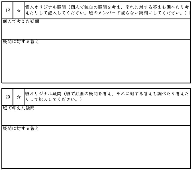 こちらから提示した問いだけではなく,自ら問いを考えさせることで,問いを作り出す力を高めることができます。次の図1のような項目を用意し,取り組んでいます。個人で考える問いと,班で考える問いを作る意図は,活動に取り組む主体性と,協働して学ぶ力を上昇させたかったからです。個人オリジナル疑問は班のメンバーと被らない制約を設けることで,必ずコミュニケーションが必要になるので,議論が活発になればという狙いもあります。評価は,「どんな問いを生み出しているか」と,「論理立て問いの答えを述べられているか」という両方を見ると生徒に伝えておく