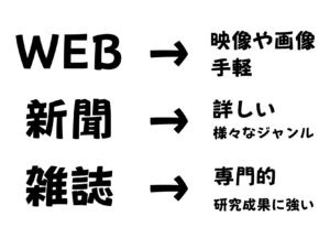 続いて,新聞です。新聞はニュースに関する情報がより詳しく掲載されていることが多いです。そのためより詳しい情報を伝えたいときに有効です。また,WEBでは情報はこちらから能動的に探しにいかなければなりませんが,新聞では様々なジャンルが網羅されているので,気が付いていなかった地学ニュースに出会えることも多いです。