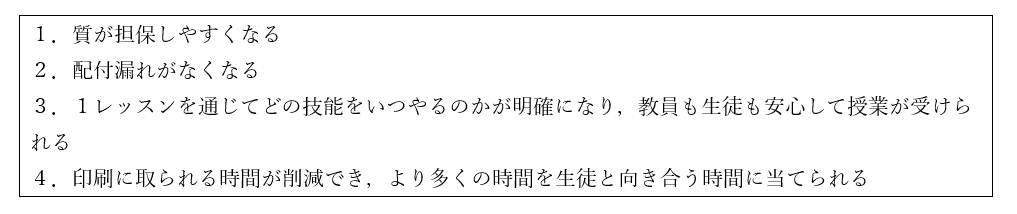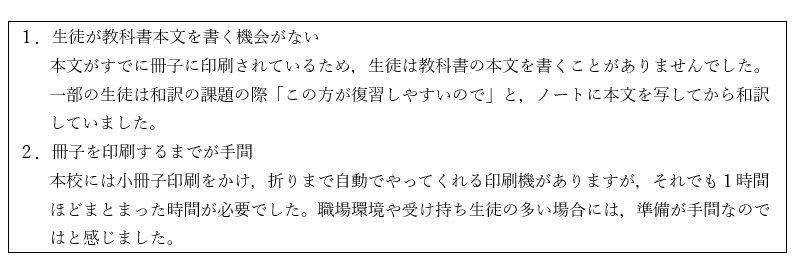 また,小冊子形式を取るにあたり,これまで手作業で行っていた多くの部分を,教科書に付属するデータを活用しながら,必要な部分だけ教員が加筆・編集することにしました。これらにより,本校生徒により適したプリント集(冊子)を,より短時間で作成できるのではないかと考え,「1レッスン1冊子方式」を取ることに決めました。