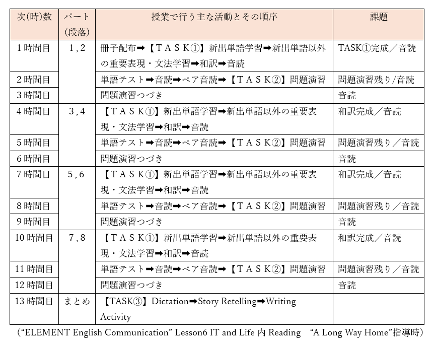 以下が,上記資料2を用いて実際に行った「Lesson6 IT and Life内Reading “A Long Way Home”」での授業展開です。(資料を見やすくするため,教科書に関する活動と課題のみ記載しています。各種副教材は,週末課題として課しています。)