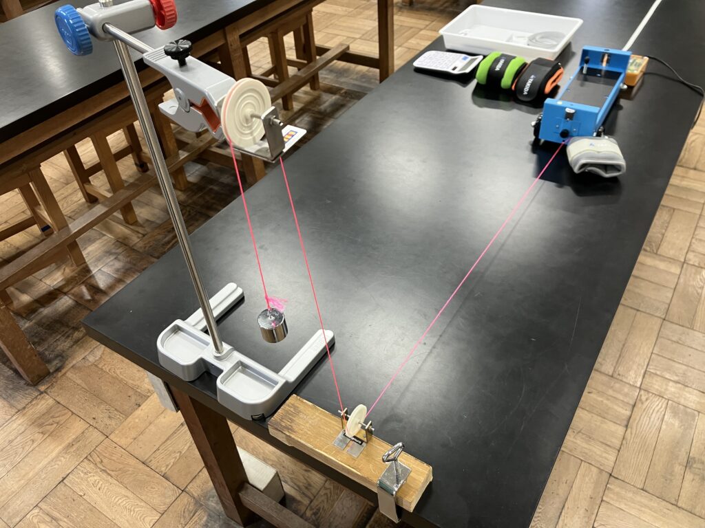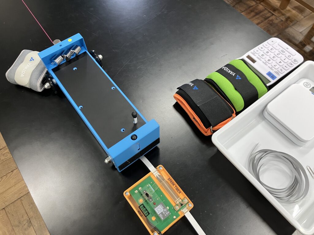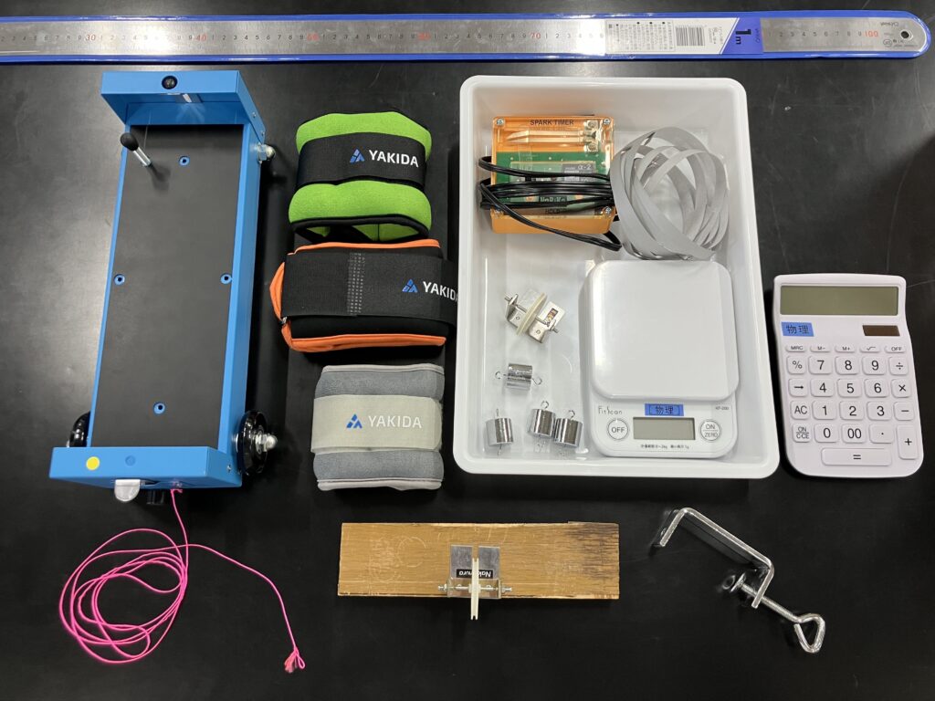 力学台車の走行距離を確保するために,糸をとおす精密定滑車は2つ使用した。机に近い側の定滑車はあらかじめ木材に固定してクランプでセッティングできるようにしておくと実験の準備が容易になる。また,力学台車に載せるおもりには,市販のアンクルウェイトを購入して使用した。この実験では,正確に500 gや1 kgの質量である必要はないため,理科のカタログ品よりも安く入手できる。