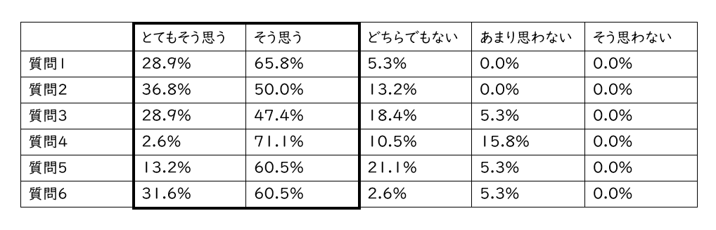 また,生徒にもCLILの授業への意識調査を行った。6つの選択肢質問と2つの自由記述質問をおこなった。