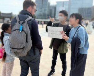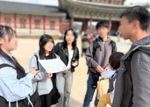 中学3年生では,探究学習の舞台を海外へと広げ,韓国への探究旅行を実施しています。生徒たちは事前学習として自分たちの興味に基づいた仮説を立て,現地でのアンケート調査や学校交流を通じて,その検証を行います。実際に異文化の中に飛び込み,現地の人々と対話することで,他国への理解を深めると同時に,国際社会における自分たちの役割を客観的に考えるようになります。 帰国後には,学んだ成果を地域へ還元する活動「プクトゥチルソンフェア」を開催します。韓国の魅力を伝えるための企画や運営を生徒自身が行い,地域の方々に紹介するこの取り組みは,情報の整理力や発信力を高める場となります。世界で得た気づきを地域に伝えるという循環の中で,まさに「グローカル」な視座を体験的に習得し,中学における探究の集大成としています。