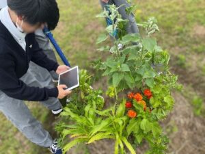 中学1年生では,日本初となる「シネコポータルを活用した生物多様性学習」に取り組んでいます。これは,耕さず,肥料や農薬も使わない「協生農法」を,シネコポータルとよばれる校内の小さな圃場で実践しています。生徒たちは,さまざまな植物や生き物が共生する環境を自らの手で作る中で,多彩な疑問を抱き,グループディスカッションをしながらリサーチクエスチョンを立てていきます。 この活動では,単に植物を育てるだけでなく,観察と記録,そして根拠に基づいた検証という科学的なプロセスを重視しています。また,高校3年生まで活用する「課題研究メソッド2nd Edition」をこの段階から使い始め,探究活動のメソッドを体得します。生命や地球環境の不思議に触れながら,科学的な視点で自然界を捉える力を養う,本校ならではのユニークで重要な探究学習の導入プログラムとなっています。
