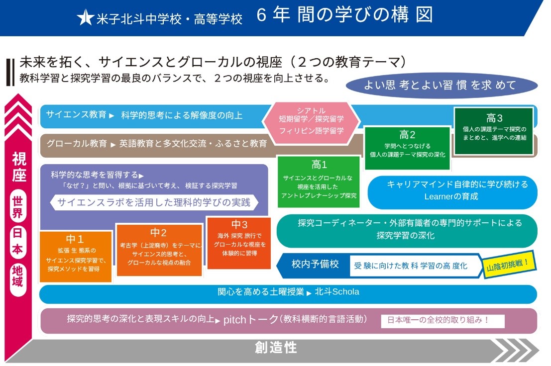 米子北斗中学校・高等学校は,校訓「自学自律」の精神を教育の柱に据えています。自ら学び,考え,判断し,責任を持って行動できる人材を育成することは,変化の激しい現代社会において非常に重要です。本校では,困難な課題を解決していく「生きる力」を身につけ,多様な課題に対してその力を発揮し,社会の各分野で指導的役割を果たせる人材の育成に取り組んでいます。 特に,現代を生き抜くために必要な「変化への適応力」「問題解決能力」「創造性」「コミュニケーション能力」の4つの力を育むため,その礎となる「よい思考」と「よい習慣」の醸成に重きを置いています。社会がどのように変化しようとも,常に何が最善かを自分事として捉え,適切に判断し行動する姿勢を,6年間の学校生活を通じて生徒一人ひとりが着実に身につけていくことを目指しています。